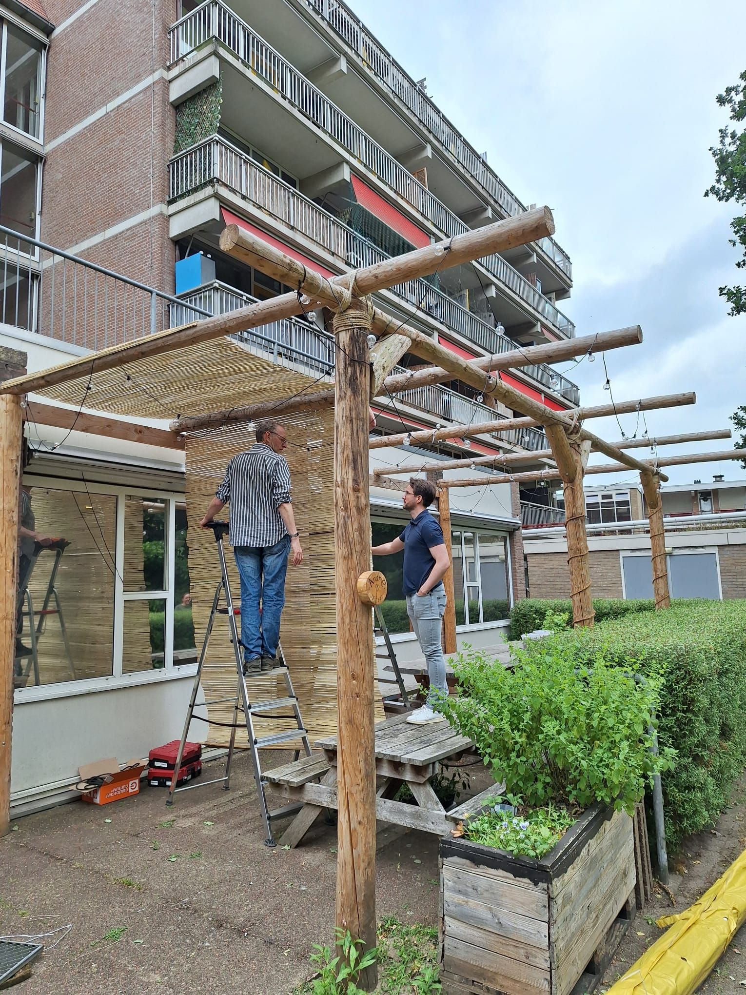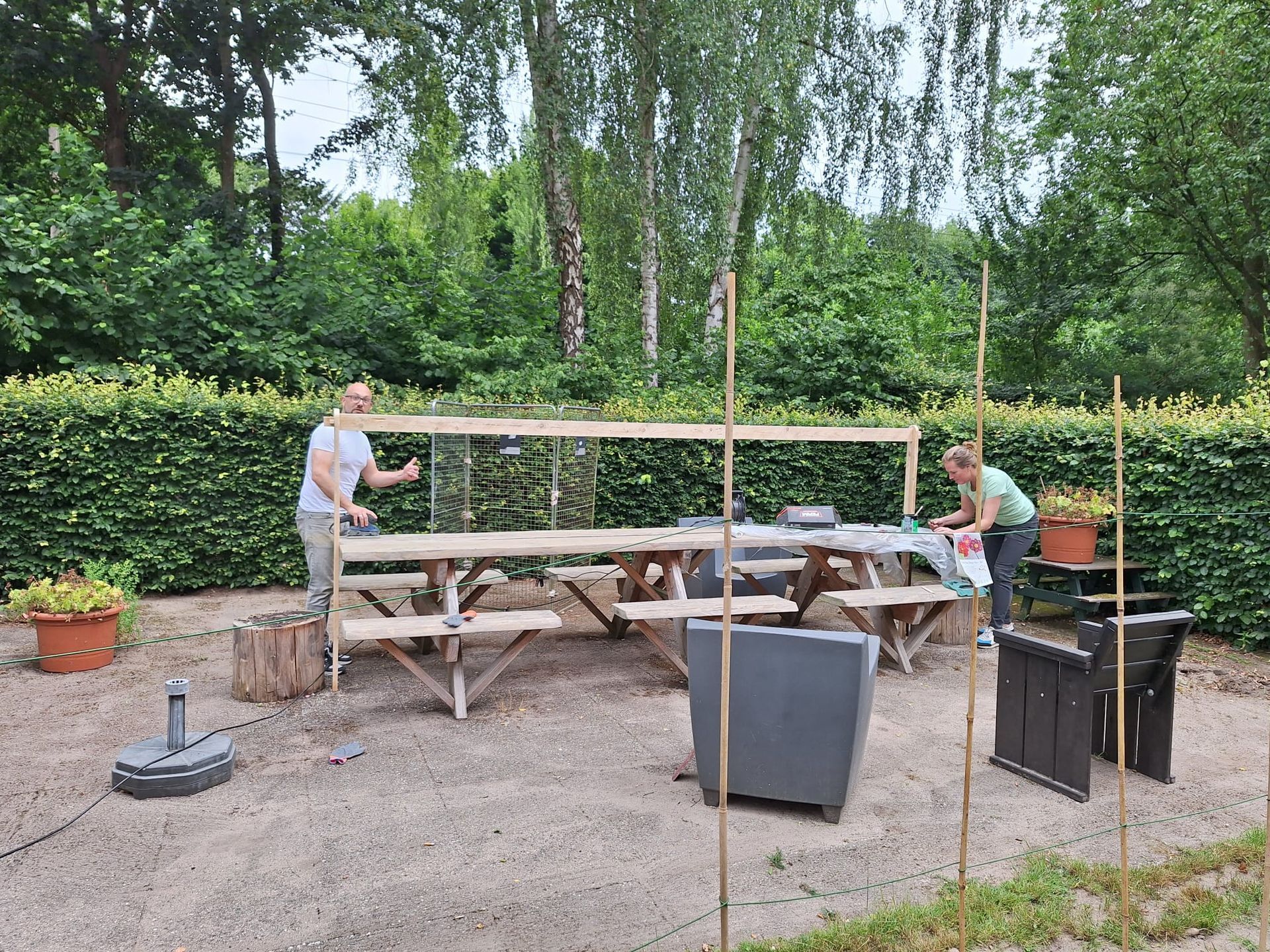 Wat een kanjers: De medewerkers verhuisden de babywinkel van boven naar beneden en richtten die mooi in. Ze plaatsten een prachtig bamboedak over de pergola, zodat we heerlijk in de schaduw kunnen zitten. Ze zetten een balk boven onze picknicktafels om plantjes en lichtjes aan op te hangen. En dat vonden ze nog niet genoeg: ze maakten zelfs nog even de tuin aan kant, maaiden het gras en plantten nieuwe plantent!