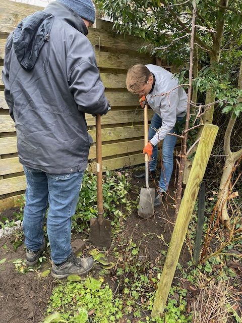 Het klusteam was deze middag uitgebreid met wethouder Jamie van Essen die benieuwd was hoe de Klussendienst werkt. Hij had zijn pak en stropdas thuisgelaten en stak zelf ook de handen uit de mouwen. De regenton in de achtertuin werd namelijk niet aangesloten op het riool, maar gaat afwateren op Dianne’s tuin. Daarvoor moest een geul gegraven worden waar een poreuze slang ingelegd werd. De wethouder heeft dus fanatiek zijn schop in de grond gestoken en met een ‘collega’ deze geul gegraven.